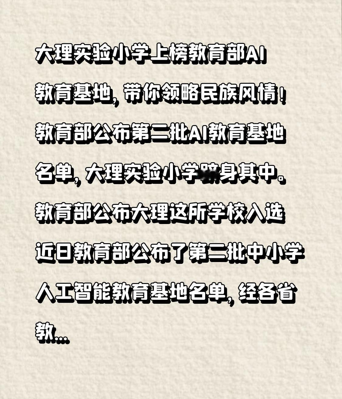 大理实验小学荣登教育部AI教育基地,共赏民族风情! 教育部揭晓第二批AI教育基地名单,大理实验小学赫然在列。 教育部官宣大理这所学校入选 近日,教育部公布了第二批中小学人工智能教育基地名单。经过各省教育行政部门推荐、教育部集中公示等一系列环节,最终确定了325个第二批中小学人工智能教育基地。云南省有10所学校成功入选,其中大理白族自治州实验小学榜上有名。云南省入选名单如下: