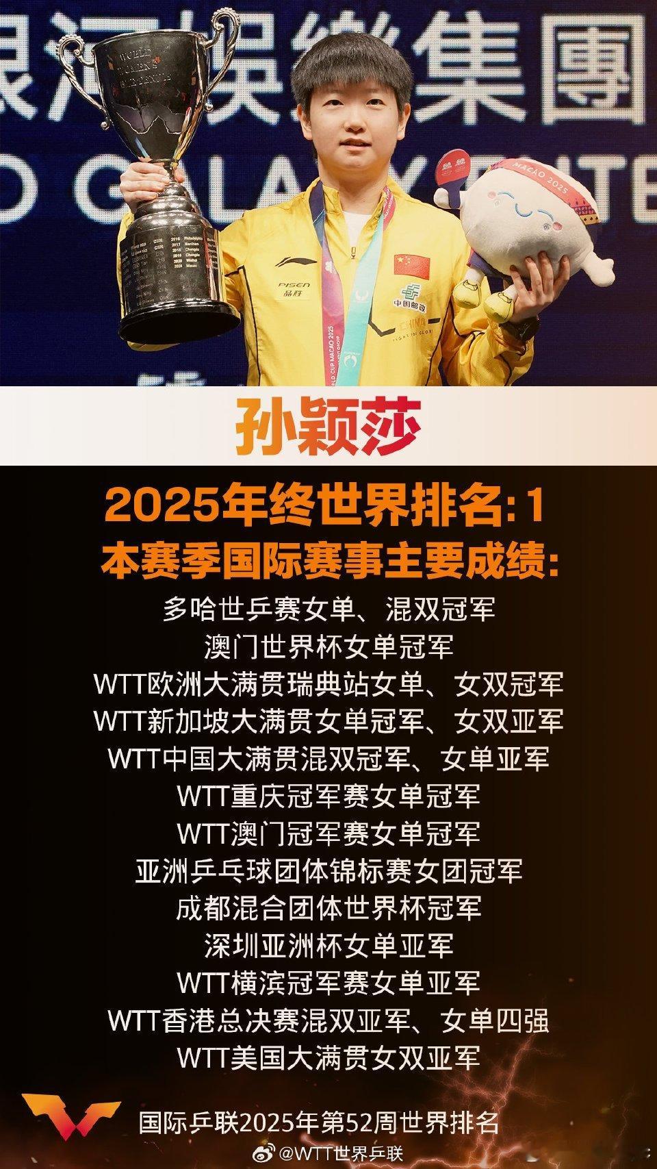 WTT发布孙颖莎2025年度总结 WTT发文:孙颖莎世界排名第一,年终积分11