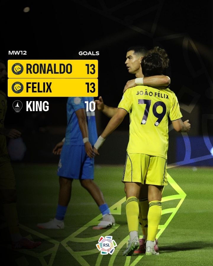 沙特联官方晒出海报,C罗和菲利克斯两名前锋占据了沙特联射手榜的前二,可见球队火力凶猛。