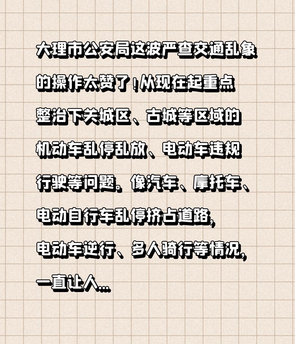 大理市公安局这波严查交通乱象的操作太赞了!从现在起重点整治下关城区、古城等区域的机动车乱停乱放、电动车违规行驶等问题。像汽车、摩托车、电动自行车乱停挤占道路,电动车逆行、多人骑行等情况,一直让人头疼。 这次不仅启用电子警察、无人机抓拍,还鼓励市民举报。之前下关中队整治电动车违法行为就成效显著,相关违法行为下降 42%,城区人行道通行率提升 65%。而且还给出临时停车方案,这是要全方位打造文明畅通的交通环境啊,必须支持!