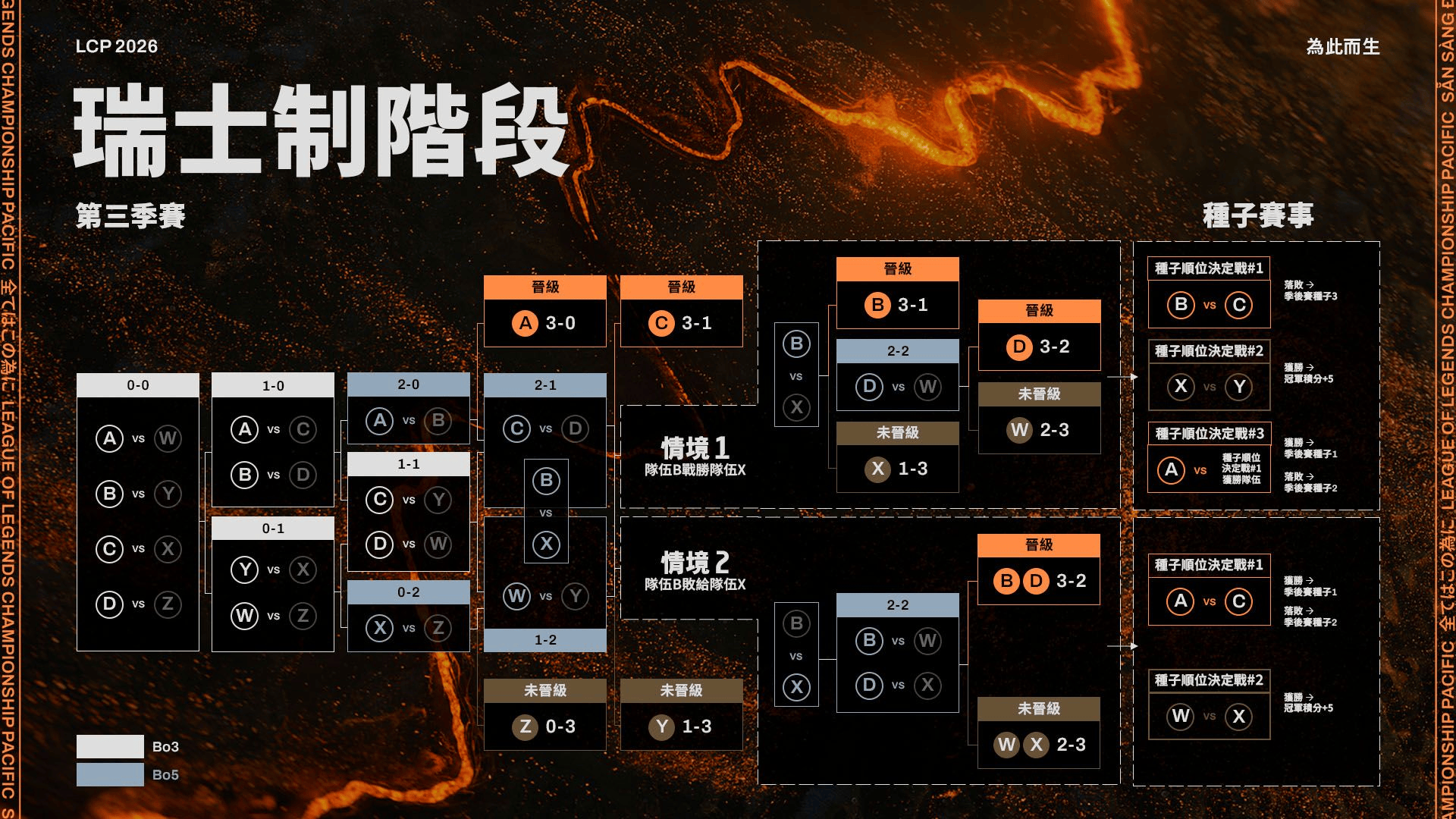 第三赛季则改为瑞士轮,值得一提的是在瑞士轮第四轮,2-0组的败方将对阵0-2组的胜方,2-1组则是1-1组获胜的两支队伍对阵,1-2组则是1-1组失败的两支队伍对阵。