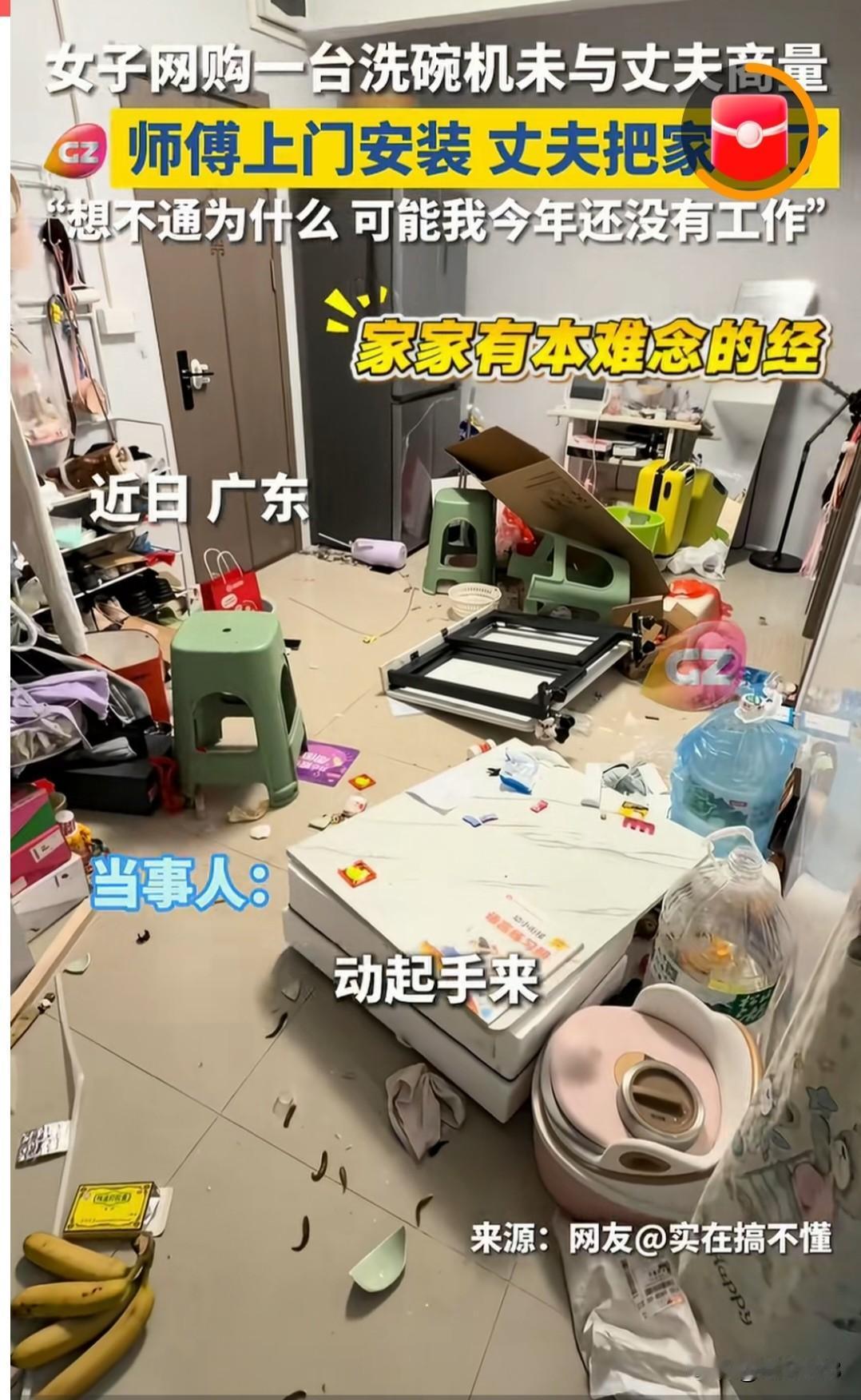 近日广东,女子哭诉,自己一年了也没工作,自作主张买了一台洗碗机,没跟丈夫商量,结果安装师傅上门时,丈夫不让按装,还把客厅给砸了。 女子觉得挺委屈,不就是买了台洗碗机吗,是不是嫌弃我没工作,他一个月的工资加提成一万左右,又不是买不起! 网友评论亮了! 估计老公压力也大,在广东一万的收入根本不多,而且老婆又没工作,洗碗完全可以自己洗,洗碗机也算高消费,理应跟老公协商,当然老公的做法也有些偏激了! 他接受得了洗碗机,接受不了一个没工作天天在家连碗都懒得洗的人! 一个租房子住的,自己还没工作,买非生活必需品的大件事也不和老公商量 三个叠加在一起,搁哪个男的不疯!