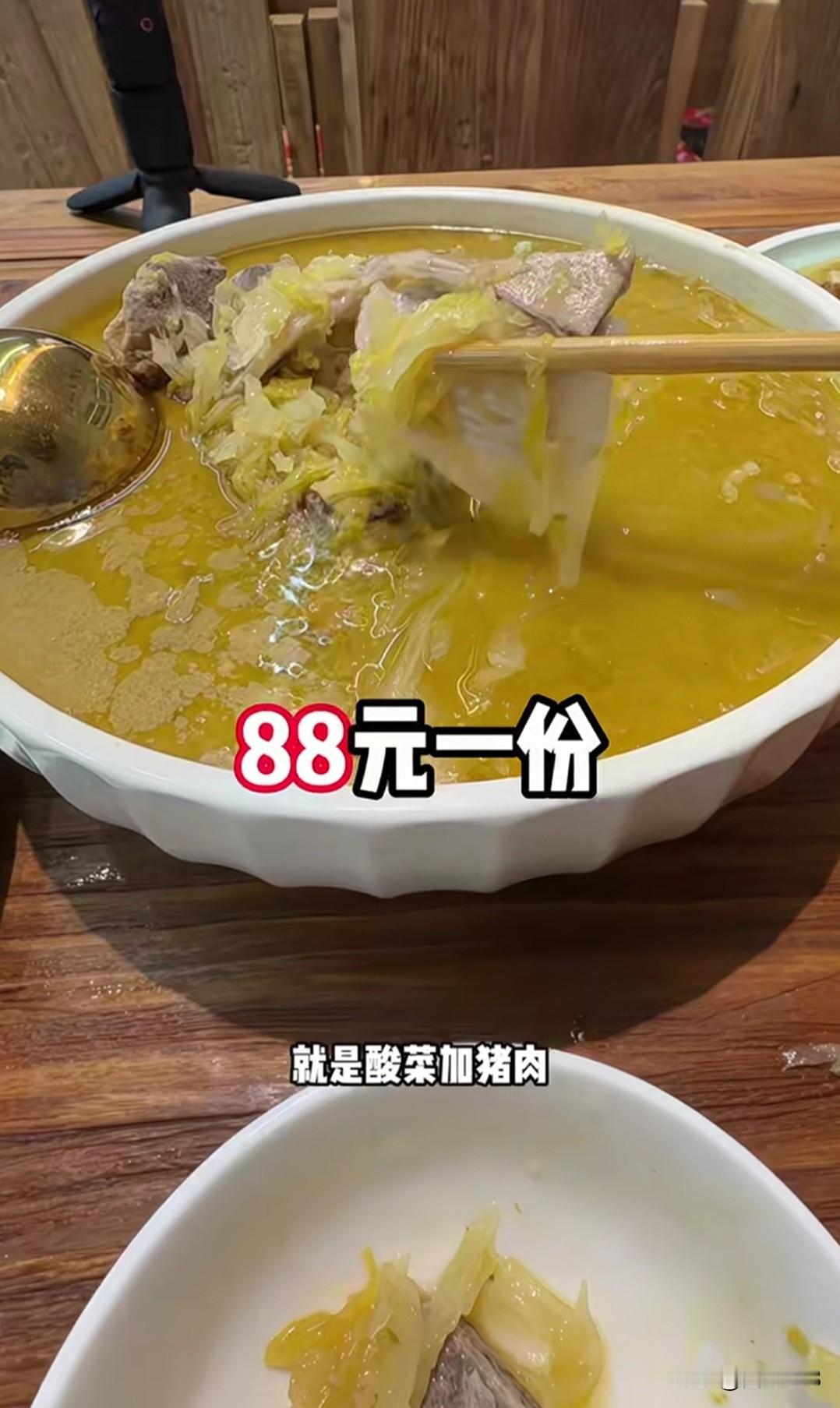 东北雪乡某饭店被网红探店吐槽,一份杀猪菜 88 元,就是酸菜加猪肉,大半盆都是汤
