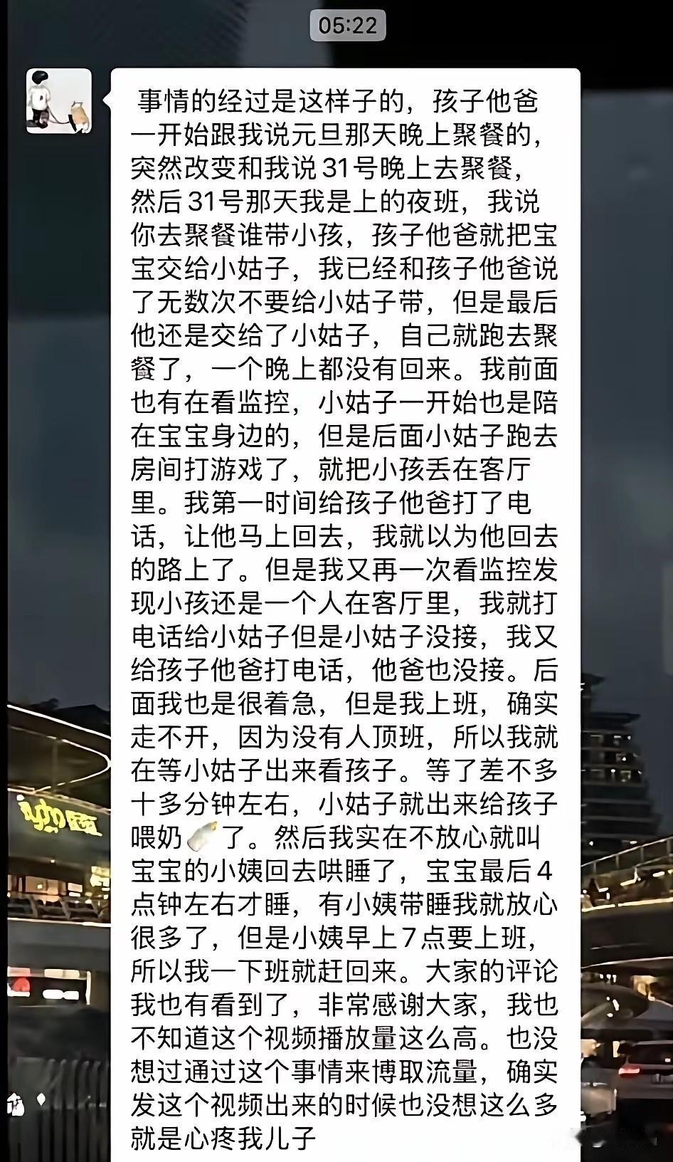 太寒心了!广西,小姑子跨年夜帮忙带娃6小时,带娃空隙去上了个厕所,嫂子监控看到了,转手发到网上,指责小姑子带娃不负责,丝毫不怪罪自己那去找朋友喝酒吃饭的老公。 跨年夜嫂子要值夜班,9个月的宝宝让爸爸带,结果爸爸不靠谱,孩子丢给自己妹妹带,自己就跑去跟朋友喝酒吃饭,潇洒跨年去了。 小姑子晚上7点下播后,就帮哥哥带娃,哄睡、喂奶、陪玩一样都不落,直到凌晨一点,才点了外卖吃。小姑子吃饱喝足,人有三急,就上了趟厕所,留宝宝一人在客厅围栏玩。 刚好值班的嫂子通过监控看到了,马上给老公和小姑子打电话,老公接了没回家,小姑子没接到电话,嫂子不放心宝宝一个人玩,大概过了10分钟,才看到小姑子出来泡奶给宝宝喝。 嫂子认为小姑子带娃不负责,之前也多次叮嘱老公不让小姑子带,这次看到小姑子带娃间隙离开了10分钟,认定她是到房间打游戏了,最后还是喊小姨上门帮忙带,才放心。 嫂子网上吐槽引发小姑子被网爆,却不曾想小姑子带娃的6个小时也是尽心尽力,帮忙带娃发被指责,小姑子感到心寒。 小姑子认为自己和哥嫂住,每月也是给了房租的,而且宝宝的衣服自己也经常买,家里的开支也帮忙分担,怎么到嫂子眼里,自己就不负责了?太委屈了。 劝小姑子还是赶紧搬出去住了,在家不受嫂子待见,以后日子不好过,相处也会很尴尬,容易因琐碎事情发生矛盾。 妈妈带娃尚且都不能24小时陪伴宝宝,小姑子帮忙带娃,其实作为嫂子应该感谢她,帮自己这个小家庭分担,而不是网上吐槽让网友谴责她,其实最该谴责的是自己老公,没有担起带娃责任,丢下孩子给小姑子就跑去潇洒,一点男人样都没有,极不负责。