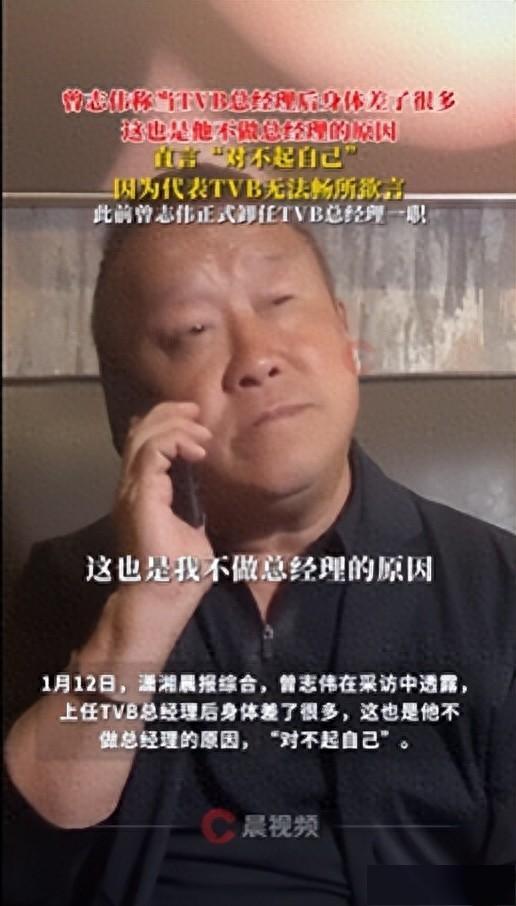1月12日,潇湘晨报综合,曾志伟在采访中透露,上任TVB总经理后身体差了很多,这也是他不做总经理的原因,“对不起自己”。自己在任期间没时间运动、睡眠时间不足、经常要应酬喝酒。