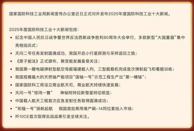 国家国防科技工业局新闻宣传办公室近日正式对外发布2025年度国防科技工业十大新闻,其中一则新闻是《歼10CE首次取得实战战果引发全球关注》。