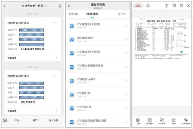 吉大一院已实现检查检验结果“实时推送+线上查阅”,报告一经生成,系统即通过微信公众号实时推送消息提醒,患者可随时在线查看、下载存档,不仅节省了往返医院的时间成本与交通成本,也减少了纸质资源的消耗,使就医流程更环保、更高效。