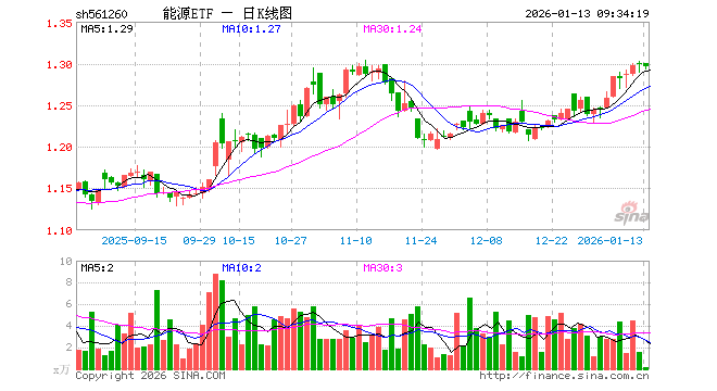 1月13日,能源ETF(561260)开盘涨0.00%,报1.300元。能源ETF(561260)重仓股方面,长江电力开盘涨0.18%,国电南瑞涨0.21%,中国核电涨0.33%,中国铝业跌0.36%,三峡能源涨0.24%,中国电建涨0.18%,国电电力跌0.20%,云铝股份跌1.14%,中国稀土涨0.00%,中国海油涨0.07%。