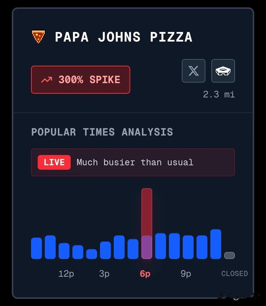 特朗普是否会对伊朗发动袭击?媒体们都在寻找蛛丝马迹: 1航班追踪网站 Flightradar24 称伊朗已关闭其空域,除非获得许可,否则所有航班不得通行;仅允许获准的往返伊朗的国际航班飞行。 2 美国空军已开始从卡塔尔的乌代德空军基地撤离军用飞机,为可能对伊朗发动打击做准备。航班追踪显示,至少已有 6架 KC-135R/T加油机持续从该基地起飞离开。 3五角大楼披萨指数14号六点开始暴增 4白宫行政大楼停车上夜间仍然是“客满”,暗示白宫今天处于加班状态。