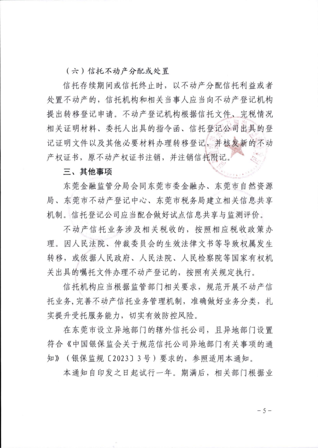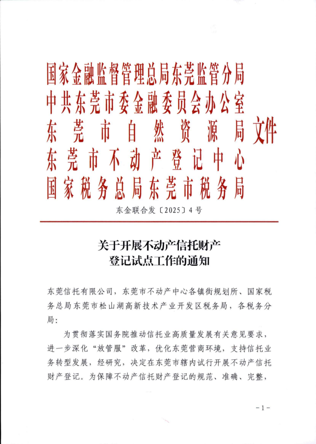 近日,东莞金融监管分局、市委金融办、市不动产登记中心、市自然资源局、市税务局等部门联合印发《关于开展不动产信托财产登记试点工作的通知》(下称《通知》)。东莞成为广东省内首个在不动产信托财产登记领域实现创新突破的地级市,标志着该项金融改革在大湾区步入“多点开花、纵深推进”的新阶段。