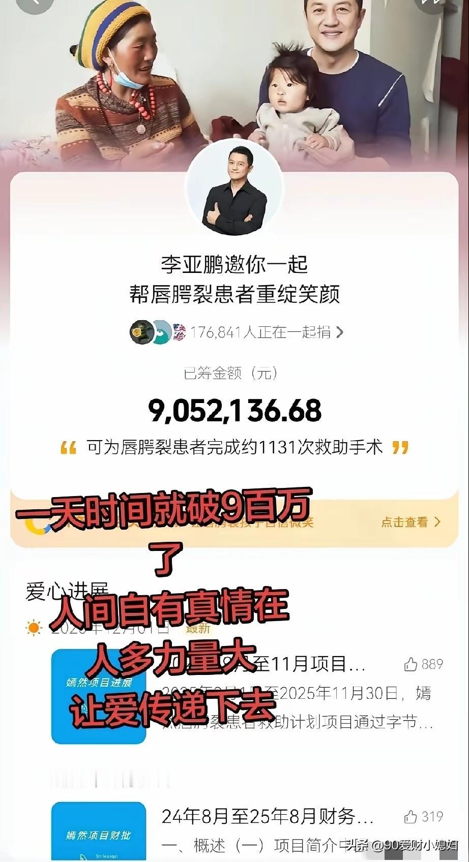 众人拾柴火焰高!李亚鹏开的嫣然天使公益医院因为付不起房租快开不下去了,网友知道后纷纷捐款,一天之内金额达到900多万,可以帮助1000多个唇腭裂患者做手术! 他之所以开这样的一个公益医院,是因为他的女儿就是唇腭裂,所以他能感同身受,很多家庭因为没钱而错过了救治的最佳时间导致孩子成了残疾。所以他想帮助这些孩子,就和王菲一起成立了这样的一家公益医院! 可这些年,李亚鹏做什么亏什么,还被朋友骗了,估计自己也没什么钱了吧! 没想到已经连房租都付不起了,这么一个做公益的医院怎么可以倒闭,网友纷纷出手,不仅直播间里礼物送不停,还捐款,一天就筹到了900多万,这个时候才能体会到毛爷爷说的人多力量大! 希望有能力的网友都能出手帮一帮,把爱传递下去,其实这也是在帮助我们普通人! 李亚鹏真的是一个很好的人,自己淋过雨就想给别人撑一把伞。其实他不是不会做生意,只是他太老实了,不懂其中的尔虞我诈,所以才会做什么亏什么吧!