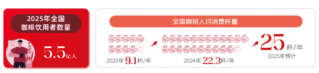 根据红餐产业研究院《2025咖饮品类发展报告》,我国消费者对咖啡的接受程度和消费频率呈上升趋势,咖啡饮用者已经达到5亿人。其中,现磨咖啡占比达45.3%,首次超越速溶咖啡成为第一大品类。这一爆发式增长的核心动力正是人均年咖啡消费频次达25杯的Z世代群体。