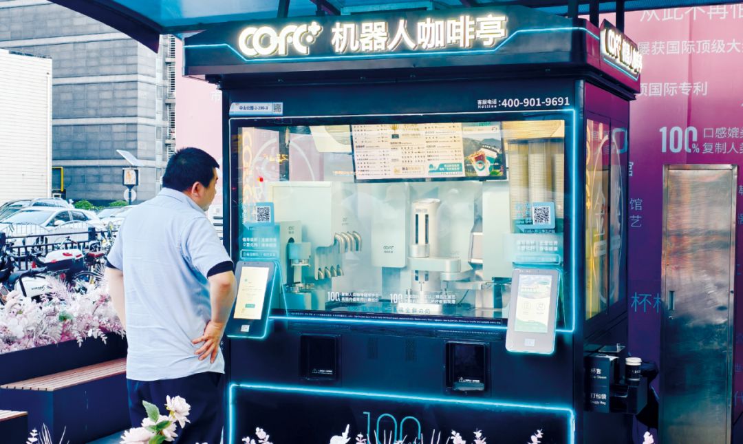 ▲机器人现磨咖啡亭亮相上海闹市街头。这款由COFE+连锁品牌历经七年研发和全球测试的产品,是打通了各国支付系统的全能冠军咖啡机器人。