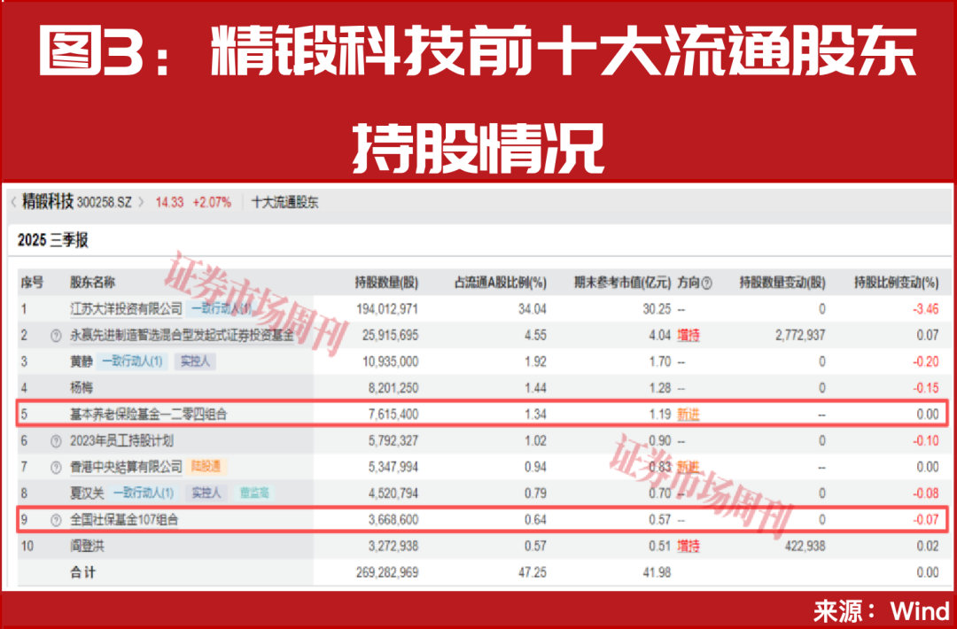 如精锻科技,2025年三季度末,养老保险基金一二零四组合、社保基金107组合分别以761.54万股、366.86万股的持仓位列公司第五大、第九大流通股股东,相较二季度末,社保基金107组合为继续重仓,养老保险一二零四组合则为新进重仓(见图3)。