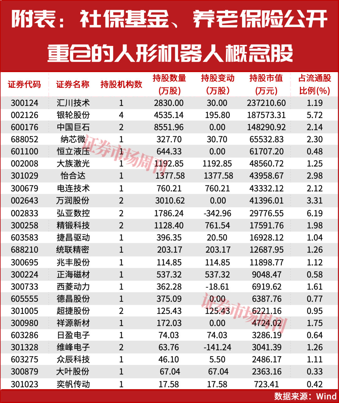 除了一级市场的直接投资,二级市场的机构持仓也能看出“国家队”对人形机器人概念的青睐。除了长期稳定持仓的汇金公司、证金公司,24只人形机器人、丝杠、灵巧手、减速器等细分概念股的前十大流通股东中出现了社保基金/养老保险的身影,10只为2025年三季度末新进重仓,6只在二季度已持仓的前提下被继续增持(见附表)。