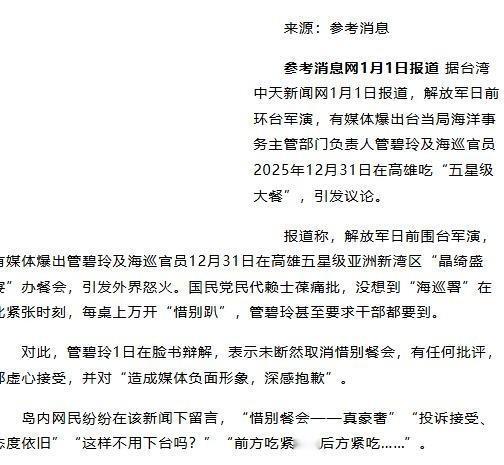 台湾彻底放弃了,谁也没想到,曾在中国人民解放军围绕台湾省进行军演期间,台湾的高层领导竟然一起聚餐。 2025年12月29日到30日,解放军东部战区开展“正义使命-2025”联合军演,涉及陆海空军和火箭军。演练范围覆盖台湾岛周边五处海空域,包括台湾海峡北部、西南部、东南部和东部。重点科目有海空战备警巡、夺取综合制权、封控要港要域和外线立体慑阻。没有提前通知,直接启动,强度高于以往。舰艇18艘,其中14艘部署在台湾北部、南部和东部水域,4艘在南部外海。战机出动201架次,125架次跨越海峡中线。火箭部队从福建发射火箭,落点在北部和西南部演习区,模拟打击港口如基隆和高雄。演习模拟封锁台湾能源进口通道,强调切断电力供应。 军演结束次日,12月31日中午,管碧玲率黄向文、陈泗川、周美伍、许静芝等海洋委员会和海巡署高层,在高雄一婚宴会馆举行活动。先开会报,讨论2025年工作总结,如海洋保育和海巡任务数据。之后转入餐叙,吃海鲜拼盘、热炒菜和汤品,持续两小时。菜单包括虾蟹鲍鱼等,费用不低。这次聚餐是为黄向文归建和陈泗川退伍安排的惜别活动,海巡署基层仍执行监控,没有中断。事件曝光后,舆论指向高层在军演刚过就聚餐,基层官兵值守而领导享用。 解放军演习密度增加,频率从2022年起升高,每次都有明确目的,如回应美国对台军售。2025年美国批准111亿美元军售包,演习紧随其后,政治意味浓厚。台湾依赖能源进口,高雄港是主要通道,封锁模拟直接针对弱点。岛内军事观察指出,这次演习贴近实战,靠近台湾本岛边界,火箭发射距离最近。台湾当局反应平淡,没有统一指挥迹象,基层自行应对。过去几年,两岸认知脱节,嘴上防御实际放空。军备升级依赖美国,但售卖多为淘汰型号,可靠性存疑。 媒体拍到聚餐照片,岛内网友批评高层缺乏危机感,称其为惜别宴或投降饭。管碧玲在社交媒体回应,承认争议,接受批评。海委会声明指活动数周前安排,即使进行,海巡署继续监控海域。黄向文归建学校,陈泗川退伍,管碧玲续任主任委员。舆论虽发酵,但渐转其他议题。类似事件反映台湾内部政治方向迷失,没有清晰战略,围着舆论转。解放军演练越来越实战化,台湾却停留在和平假设中。 台湾军人吐槽上面没方向,下面全靠扛。国际社会关注演习,部分声音称其常态化,但频率高说明推进准备。台湾民众越来越疑虑政府应对能力。海洋委员会角色关键,主管海岸巡防,却在敏感期聚餐,凸显机制失灵。基层海巡船艇巡航,雷达扫描,没有松懈,但高层举动影响观感。美国承诺支持台湾安全,特朗普表态确保,但关键时刻出手不确定。亲美力量担心外援靠不住,自己准备不足。 演习中,解放军部署密集,科目围绕控制区域和断交通道。台湾军事事故频发,训练成表演,战力提升存疑。聚餐事件不是孤立,过去类似不当安排屡见。民众常识清楚,家门口演练需动作,但当局表态缺失。两岸关系认知脱节加剧,防御喊得响,操作跟不上。解放军每场演习都有目的,常态不等于威胁小。 台湾当局失误不止时间点,整体反应链空白。没有预案预判,面对压力不作为。国际视台湾为靠不住力量。聚餐虽公务,但时机敏感,信号负面。老百姓看到不作为政府。军人信心不足,民众更甚。现实不会因忽略改变,演练只会贴近实战。 这种集体心理逃避,根源在内部失方向。政府围舆论转,缺乏稳健方式。外部舆论偏差,称演习常态,实则麻痹判断。台湾选择已放弃,装没看见导弹试射。聚餐事件折射态度,演习上门却风平浪静。