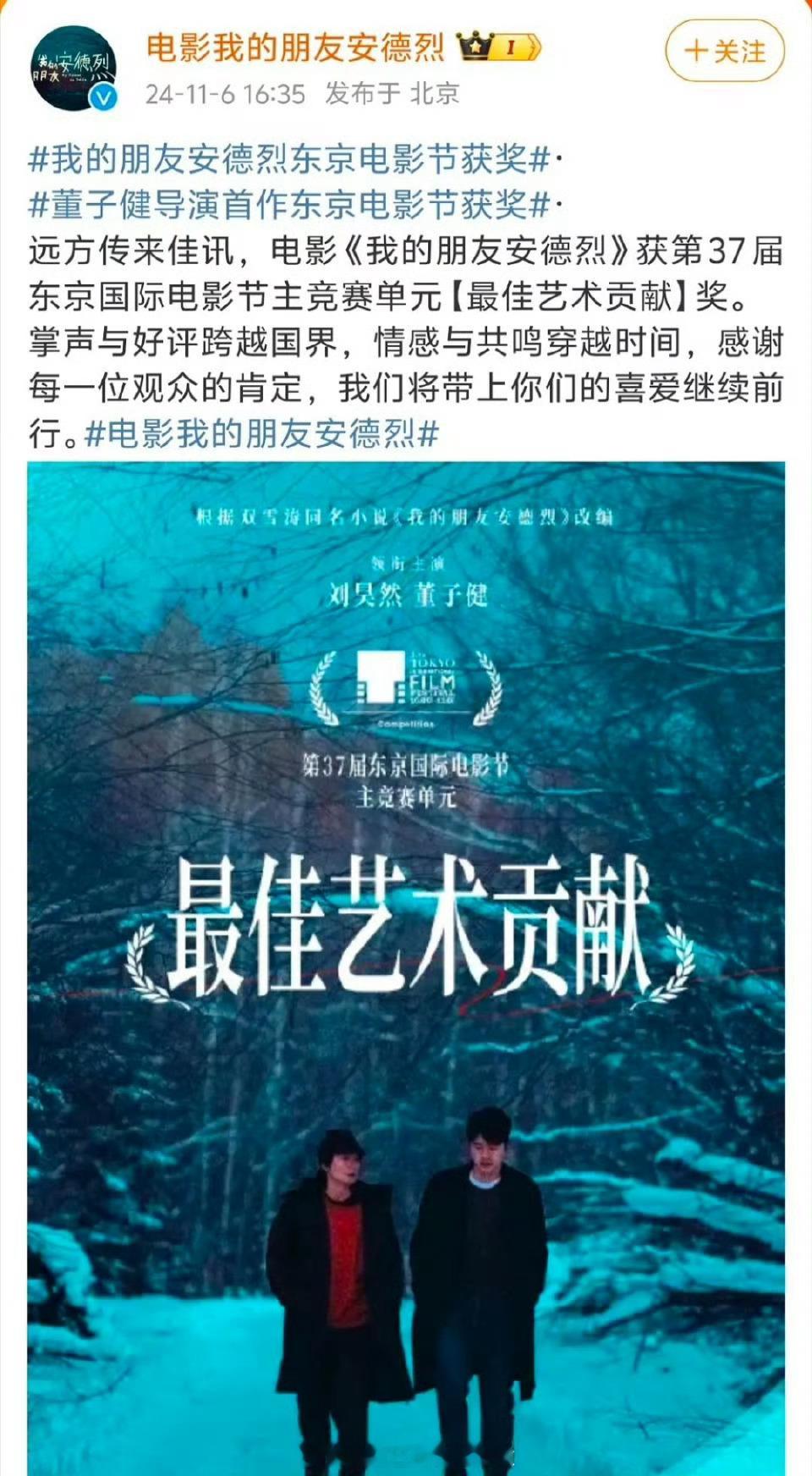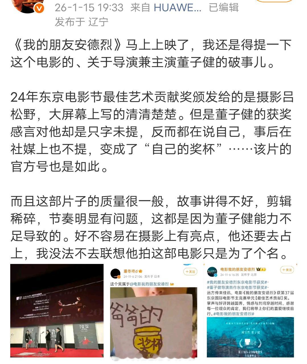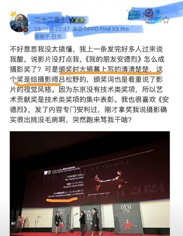 豆瓣刷屏了一整天董子健和安德烈摄影师吕松野的奖项争议,网友疑惑为什么摄影师拿的奖,却全程没有上过桌。糊也有糊的好处吧,24年东京电影节的时候,这件事根本没有激起任何水花。。。孙怡 我的朋友董子健 董子健回复孙怡我的朋友安德烈