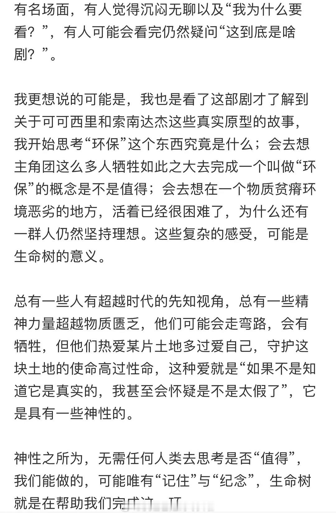 杨紫胡歌《生命树》最新repo:剧主要讲打击盗猎的故事,新鲜刺激,没见过的题材。前期更接近犯罪片,有真实的枪战和震撼的名场面。群像叙事,不是特别偏女主,演员表现很好,质感在线大剧品质,非说教意味主旋律剧。唯一的担心是害怕观众吃不下这种题材,觉得沉闷无聊。