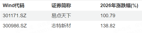根据Wind数据,截至1月16日,年内A股市场的翻倍股还有易点天下和志特新材,分别涨超100%和138%。