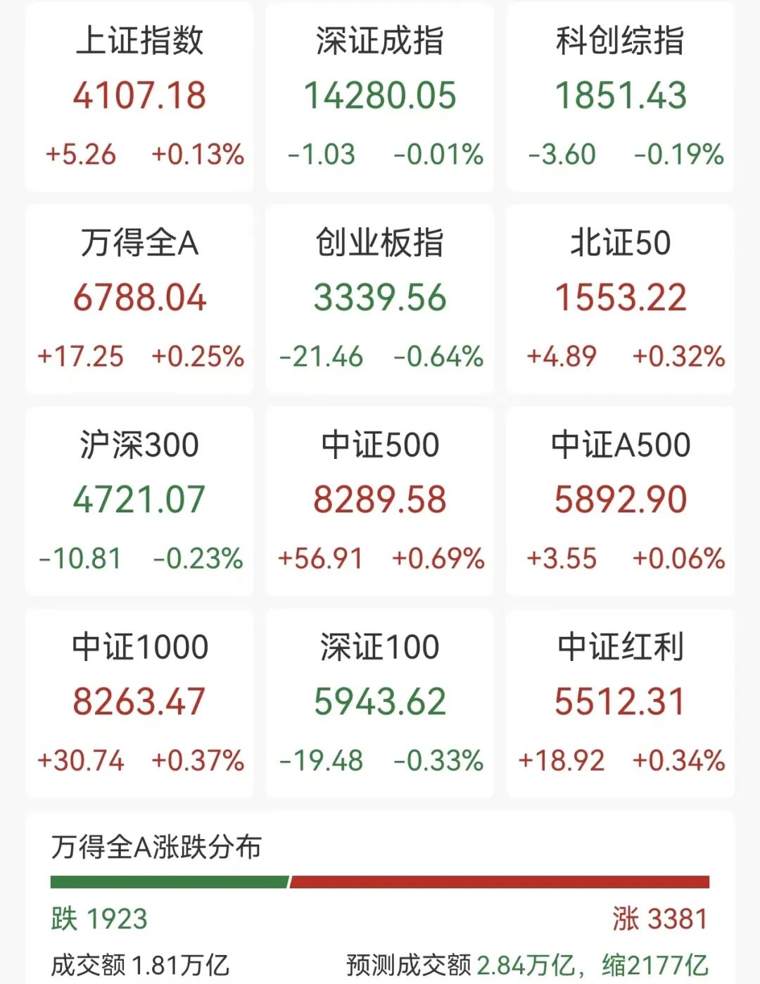 1月19日,A股市场早盘冲高回落,沪指突破4100点,深成指、创业板指均翻绿。截至上午收盘,上证指数涨0.13%,创业板指跌0.64%,全市场有3381只个股上涨。