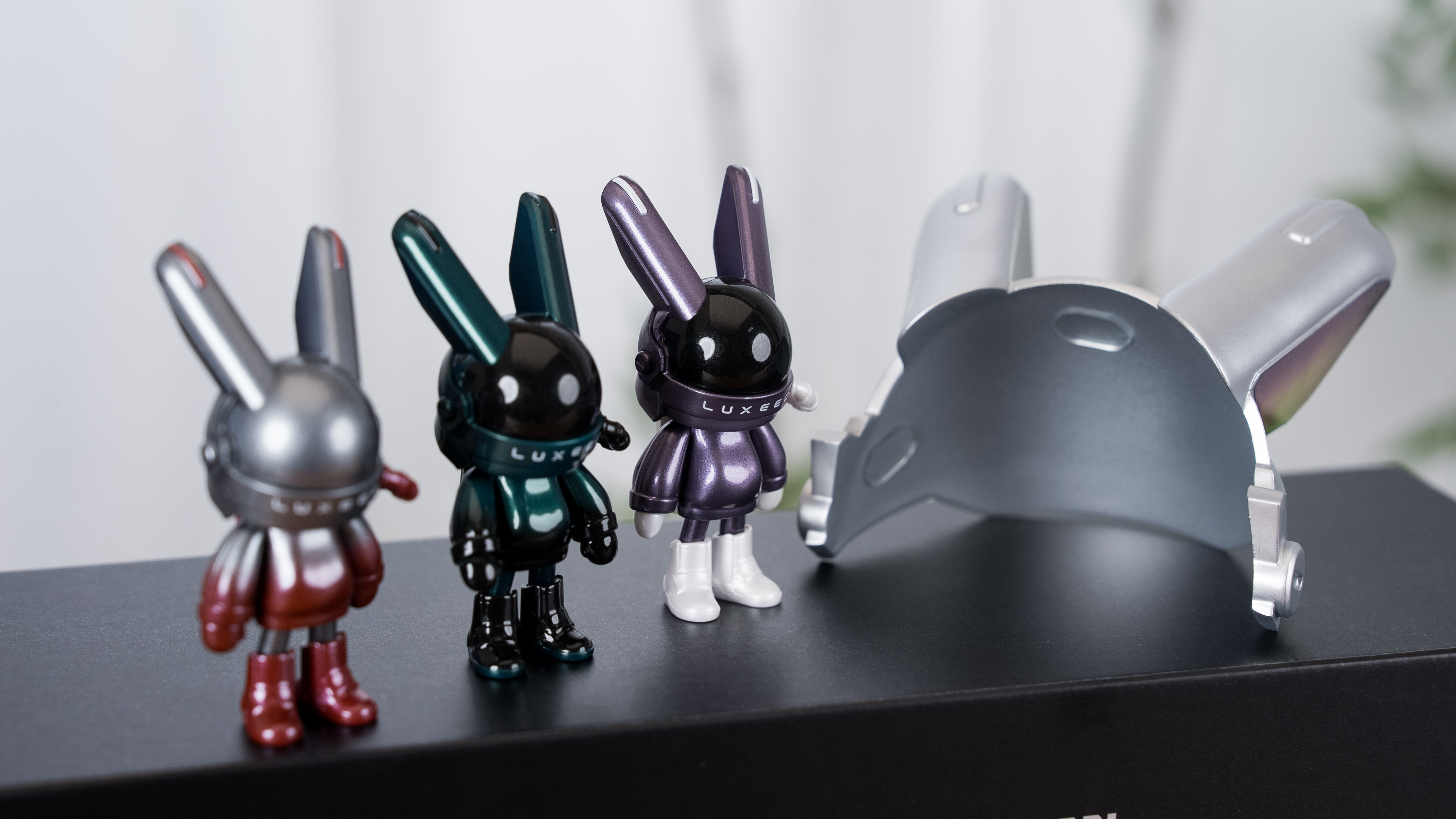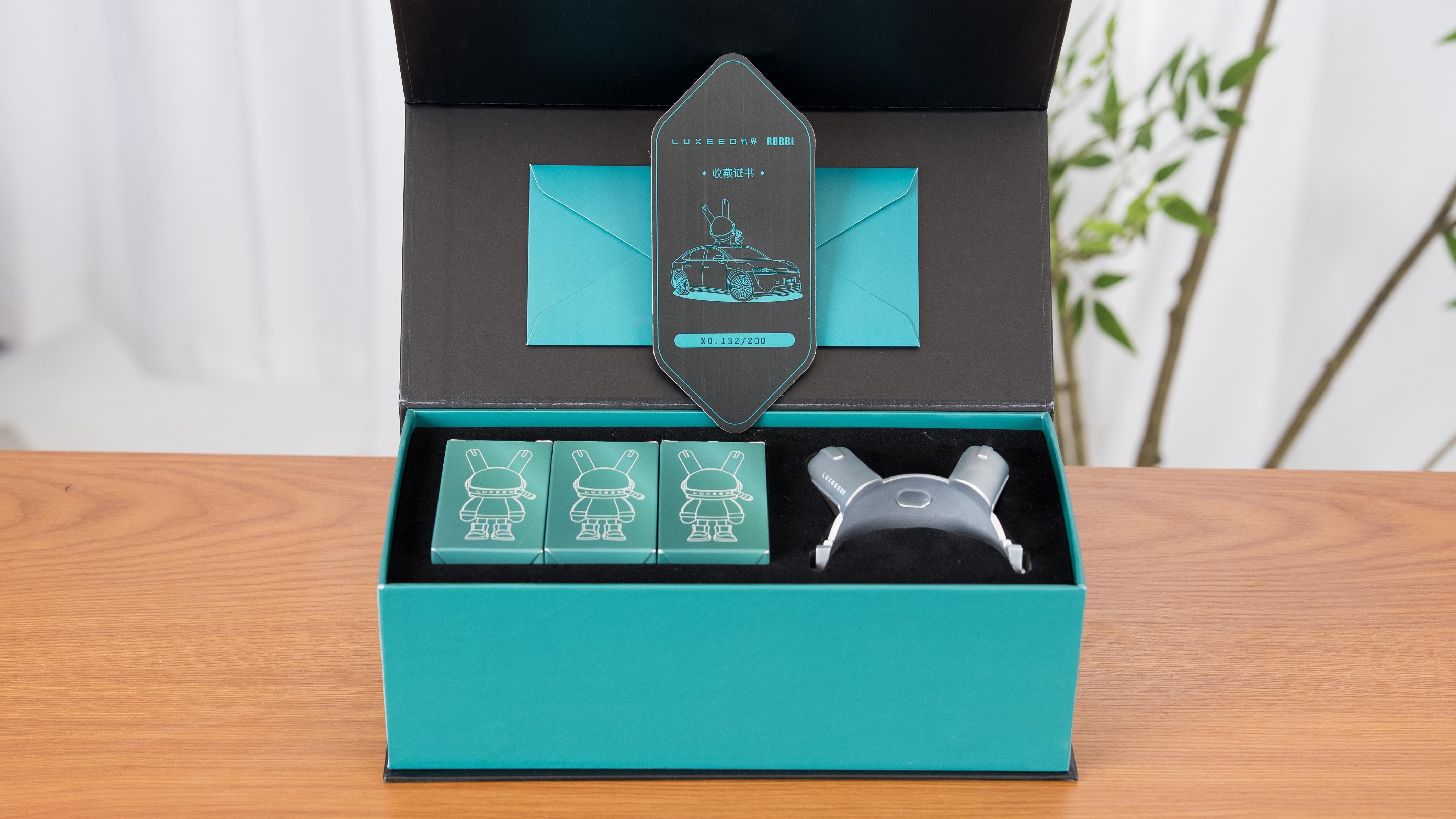 智界&ROBBi联名礼盒里面有3个专属车色定制手办1个可以装在车里的音响帽还有一