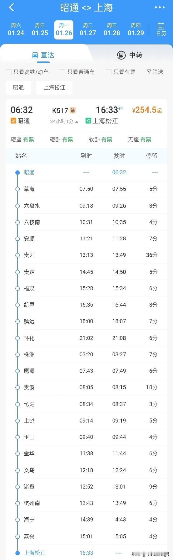1月26日起,昭通首次始发开行至上海方向的快速列车,不过没有返程 昭通位于我国的云南省东北部的昭通市,昭通站,作为昭通市唯一的一个客运火车站,到发旅客列车,途经线路是内六铁路,站台规模为4台九线,列车的终点方向主要有内江和贵阳方向,并没有长途的列车。 而2026年1月26日起铁路调图,昭通站首次始发开行一趟长途列车K517次列车,将昭通和上海两地用火车直接连接了起来,全程仅需要254.5元,耗时却超34小时,要一天半的时间才能到达上海。 不过这趟列车依然是为昭通站扩展了可到达的方向和城市。 不过这趟列车并没有反向车次,也就是上海站到昭通站的长途列车。与之对应的反向车次k515次列车终点站只到贵阳,而列车交路上,又顺接贵阳至昭通的k9553次列车,加在一起也是耗时34小时左右。看来上海到昭通方向,只能在贵阳中转一下了。 而预计2026年底,昭通的第2座火车站,渝昆高铁昭通东站预计开通运营,这座高铁站的开通,也将为交通能够开行更多方向的旅客列车创造条件。