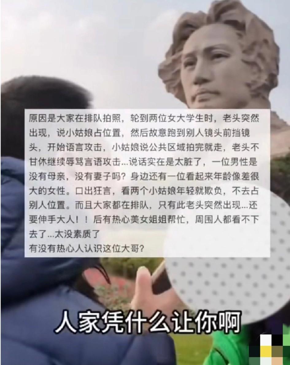 湖南长沙橘子洲。网友发视频称:大家都在有秩序的排队拍照,轮到两位女大学生时,男子突然出现,说小姑娘占位置,然后开始语言攻击,小姑娘说公共区域拍完就走,男子继续辱骂,而且话特别难听…… 最后,一热心小姐姐实在看不下去,帮着小姑娘怼这个男子…… 以上都是视频发布者的一面之词。就比如网友说“这个男的是突然出现,说小姑娘占位置”,这个描述就好像有点说不通,谁无缘无故会指责人家占位置,我猜可能前面还有事。当然,这个男的这么骂女孩子,肯定是不对的! 大家觉得呢?