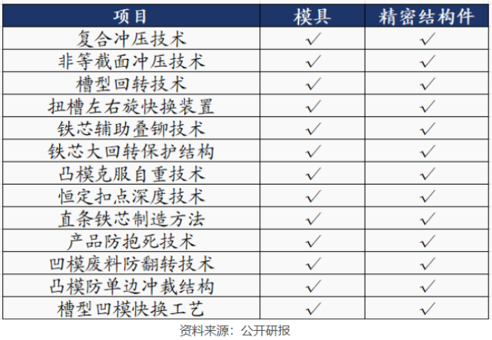 具体来说,公司精密模具与电机铁芯、结构件产品生产工艺高度类似,所需技术如复合冲压、非等截面冲压等至少20多项技术存在复用。
