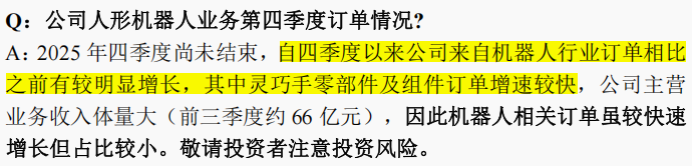 2025年12月,震裕科技曾对自身人形机器人业务订单做出说明: