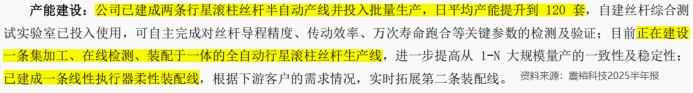 落实到产能上,截至2025半年报,震裕科技已建成两条行星滚柱丝杆半自动产线,日均产120套,建成一条线性执行器柔性装配线。另外,其正在建一条集加工、检测、装配于一体的全自动行星滚柱丝杆生产线。