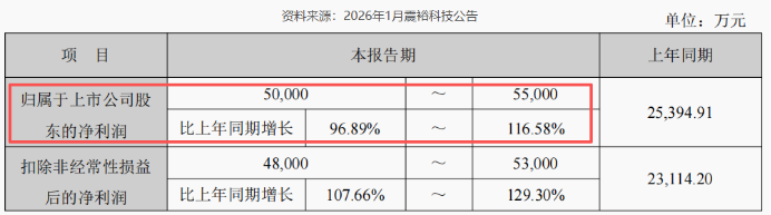 1月15日,这家锂电产业链巨头公告,2025年预计实现净利润5亿-5.5亿,同比增长96%-116%;扣非净利润增速更是最高约达130%。