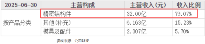 目前,震裕科技业务主要由锂电池结构件、电机铁芯、模具三大板块构成。其中,前两者最为核心(即精密结构件),2025上半年合计营收32亿,占比近80%。