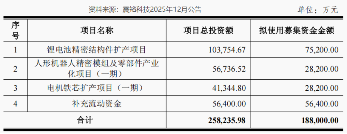 而这份翻倍级的业绩,也为震裕科技此前披露的可转债扩产计划提供了强力背书——就在2025年12月24日,公司称拟发行总额不超过18.8亿的可转债。