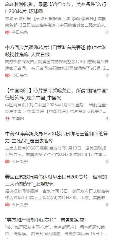 这回美国人算是彻底傻眼了!本来以为只要稍微松个口子,中国就会感恩戴德地照单全收,结果却被狠狠地甩了一个冷脸!   麻烦看官老爷们右上角点击一下“关注”,既方便您进行讨论和分享,又能给您带来不一样的参与感,感谢您的支持!   过去几年,美国在芯片领域对中国下足了狠手,又是禁止高端芯片出口,又是联合盟友围堵技术,把高压管控玩得明明白白。可他们没料到,这场 “科技封锁” 没能打垮中国,反倒先让自己的芯片企业遭了殃。   曾经风光无限的美国半导体巨头们,一个个陷入利润下滑、库存积压的困境。2023 年一季度,英特尔净亏损 28 亿美元创下纪录,AMD 净亏损 1.39 亿美元,美光科技更是出现 20 年来最大季度亏损。裁员潮跟着袭来,泛林、IBM、3M 等企业短短时间内裁员近 8000 人,整个行业一片哀嚎。   中国作为全球最大的芯片市场,消化了全世界 40% 以上的芯片产量,美国企业想绕开这个市场谈发展,根本不现实。美国半导体产业协会总裁约翰・纽菲尔都坦言,不管出于什么顾虑,美国半导体公司不能缺席中国市场。   眼看本土企业快扛不住了,美国政府终于松口。2026 年 1 月 13 日,美国商务部正式宣布放宽部分 AI 芯片出口管制,将英伟达 H200、AMD MI325X 等芯片的出口审核从 “推定拒绝” 改为 “逐案审核”。   在美方看来,这已经是天大的 “恩赐”。他们满心以为,中国企业会像饿极了的人见到面包一样,立刻蜂拥而上递交申请,感恩戴德地照单全收。毕竟在他们的固有认知里,中国芯片产业离不开美国技术。   可现实狠狠打了美方的脸。面对这波 “松绑” 信号,中国没有丝毫急切,反而摆出了冷静到近乎 “无视” 的态度。国内企业既没有主动申请采购,也没有表现出任何依赖,这种反应让美国政府和企业都傻了眼。   美方之所以碰壁,核心原因之一就是他们的 “松绑” 根本不是真心实意,而是附带了一堆苛刻到离谱的条件。中国客户购买的 H200 芯片数量不能超过美国客户的 50%,芯片要先经美国第三方测试,企业还得证明有 “充分的安全措施”,甚至特朗普还要求上缴 25% 的销售收入。   这种 “施舍式” 的放松,谁看了都明白背后的算计。美方想一边赚中国市场的钱,一边继续限制中国技术发展,既不想让中国拿到最先进的技术,又舍不得放弃巨额利润,典型的 “既要又要还要”。   更重要的是,经过这几年的技术封锁,中国早就看清了一个道理:芯片关乎国家战略安全,把命运交到别人手里,迟早会被 “卡脖子”。所以这些年,中国一直在全力推进芯片产业链的系统性补课,国产化替代的脚步从未停歇。   如今,中国在 28nm 以上中低端芯片领域已经实现自主研发和生产,2022 年就完成了 14nm 芯片量产,能满足国内 90% 以上的市场需求。虽然高端芯片制造还有短板,但国产 GPU 正在快速迭代,越来越多的本土企业在突破技术瓶颈。   中国企业早就不是当年那个离不开美国芯片的状态了。美方松绑的芯片本身就不是最先进的型号,还带着一堆限制和风险,企业自然不愿再绑定美国技术路线,给自己的发展埋下隐患。   中方的态度也通过官方渠道表达得明明白白。商务部多次强调,美方的出口管制措施是典型的单边霸凌行径,严重损害中国企业权益和全球供应链稳定。即便美方调整了部分表述,歧视性措施的本质并没有改变,中方坚决反对。   清华大学专家肖茜也点透了美方的矛盾:全面封堵没能阻断中国 AI 发展,反而倒逼国产技术崛起,美方这才不得不做出妥协,试图在遏制中国和避免自身损失之间找平衡。可这种矛盾的政策,根本不可能达到他们想要的效果。   现在轮到美国陷入两难境地了。继续强硬封锁,本土企业扛不住,技术优势会因为失去市场而逐渐萎缩;放松管制,又怕中国趁机加速技术突破,彻底摆脱对美国的依赖。这种摇摆不定的状态,让美国的处境格外尴尬。   有分析指出,美国允许 H200 芯片出口的做法,更像是个 “创可贴”,只是暂时掩盖国内政策制定者的分歧。那些苛刻的限制条件不仅难以执行,还会让中国企业更加坚定自主研发的决心。   比尔・盖茨早就说过,美国的芯片禁令只会迫使中国花时间和金钱制造自己的芯片,永远无法阻止中国拥有强大的芯片。如今看来,这句话正在一步步变成现实。   美方这次算是彻底明白,中国已经不是那个会为了一点技术就妥协的国家了。随着中国芯片产业的不断成熟,美方的技术控制权正在逐渐失效,曾经的优势正在被自己的短视政策一点点消耗。   这场芯片博弈的走向已经很清晰:谁掌握核心技术,谁才有话语权。美方想靠 “松绑” 来拿捏中国的时代已经过去了,中国会沿着自主创新的道路坚定走下去,而美国终将为自己的单边主义和保护主义付出更多代价。