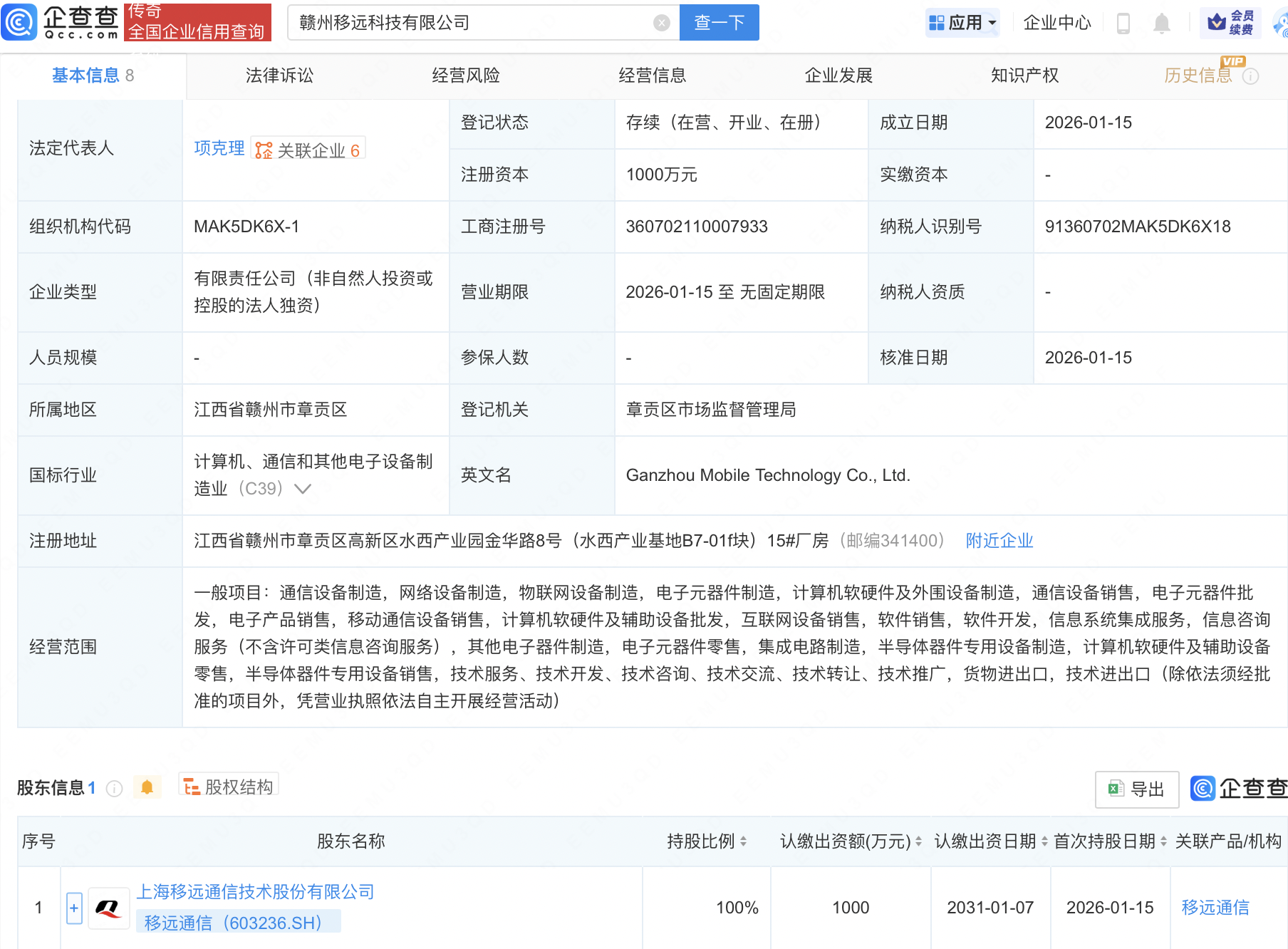 企查查APP显示,近日,赣州移远科技有限公司成立,注册资本1000万元,经营范围包含:集成电路制造,半导体器件专用设备制造,计算机软硬件及辅助设备零售,半导体器件专用设备销售等。企查查股权穿透显示,该公司由移远通信(603236)全资持股。