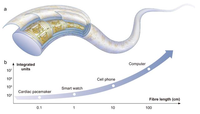 团队跳出“仅利用纤维表面”的惯性思维,提出多层旋叠架构的设计思想,即在纤维内部构建多层集成电路,形成螺旋式旋叠结构,从而最大化地利用纤维内部空间。基于实验结果推算,即便按照目前实验室级1微米的光刻精度,长度为1毫米的“纤维芯片”可集成1万个晶体管,其信息处理能力可与植入式起搏器芯片相当;若“纤维芯片”长度扩展至1米,其集成晶体管数量有望提升至百万级别,这一集成数量将超过经典计算机中央处理器(例如英特尔386TMSL)的晶体管集成水平。