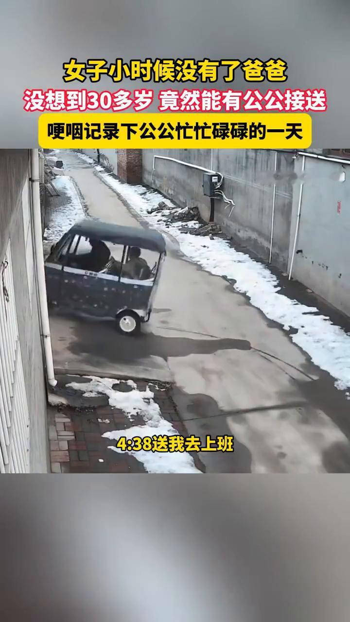 女子小时候没有了爸爸,没想到30多岁竟然能有公公接送。 乐享平湖。 哽咽记录下公公忙忙碌碌的一天。我小的时候都没有爸爸接送我上下学,我现在30多岁了竟然有爸能接送我,我觉得我太幸福了。 这是我的公公,8:03他送我儿子上学,10点他去帮我取快递,他说外面太冷了让我不要出来。11:10他去接我儿子,1:33送我儿子上学,4:15接我儿子放学,4:38送我去上班,他说路上有雪要送我,6:54接我下班。