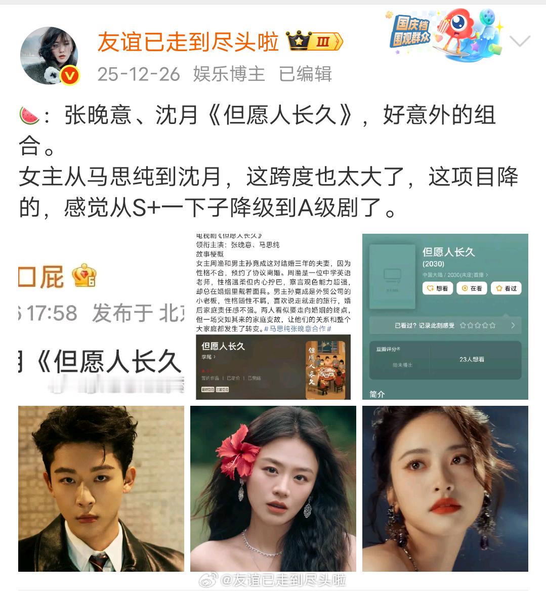 张晚意、沈月《但愿人长久》组讯来了这部剧不该遛马思纯的,不管是女主角色适配度、cp化学反应、主演综合咖位都是上上之选,凭空拔高了粉丝和观众的期待,所以才会对现在的组合这么抵触。。。