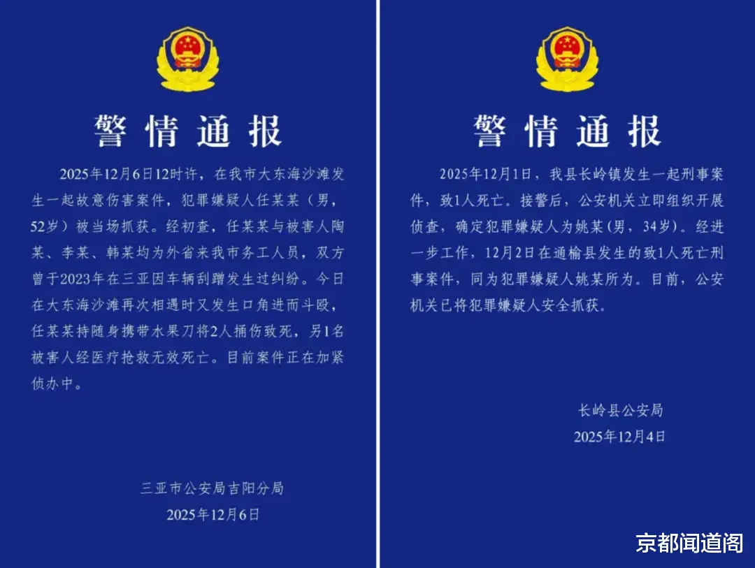 就在两天前,吉林省松原市长岭县通报:12月1日,长岭镇发生一起刑事案件,致1人死亡;次日,通榆县又发命案,致1人死亡。两案嫌疑人均为姚某(男,34岁),现已落网。