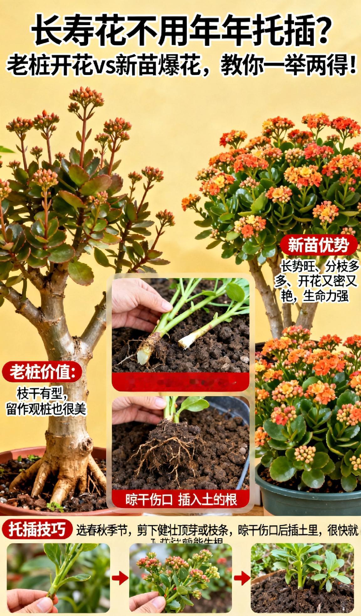 vs 新苗爆花,教你一举两得! 很多花友以为长寿花必须每年重新扦插,其实老桩养护好也能持续开花。但时间长了,老桩枝条容易老化,开花越来越少,还可能徒长、生病虫害。 更稳妥的做法是:每1-2年扦插一次新苗! ✅ 新苗优势: 长势旺、分枝多、开花又密又艳,生命力强。 ✅ 老桩价值: 枝干有型,留作观桩也很美。 🌿 扦插一点不难: 选春秋季节,剪下健壮顶芽或枝条,晾干伤口后插土里,很快就能生根。新手也能轻松成活! 💡 最佳方案: 老桩新苗一起养,既赏型又观花,一花变多花,年年有花看! 长寿花养护 阳台养花 扦插技巧 爆花秘诀