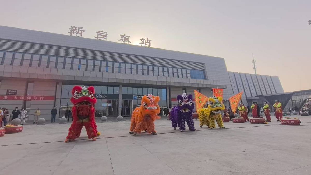 “咚咚锵!咚咚锵!”2月2日上午9时50分,新乡高铁东站站前广场早已热闹非凡。伴随着牧野战鼓震天的节奏,朗公庙竹马队员身着彩衣策马“奔腾”,和邦狮艺的雄狮踩着鼓点跳跃腾挪——由新乡市文化广电和旅游局主办的“非遗暖旅途乡味伴你行”活动在此启幕,为春运首日过往旅客送上一场充满牧野风情的新春文化盛宴。