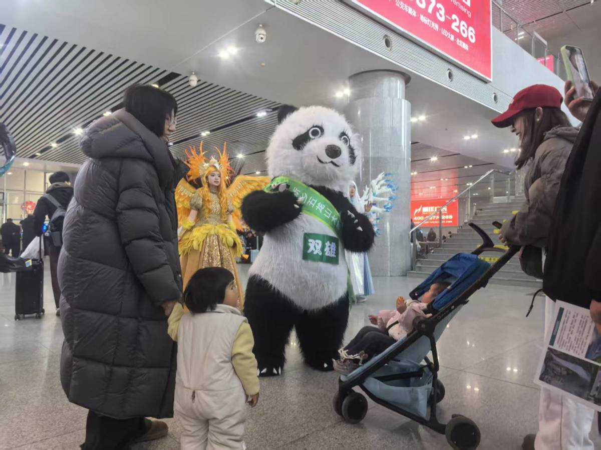在高铁东站候车大厅,另一番热闹场景同样吸引着旅客。五龙山景区的NPC演员身着“仙神”主题服饰,向旅客现场推介“冰雪迎春”主题线路,邀请旅客“春节来新乡游玩;五龙山景区的吉祥物大熊猫“娇奥、双熊”与小朋友击掌互动,还送出了魔方、发箍等五龙山文创产品。幸运旅客李女士惊喜地说:“本来计划春节宅家,现在决定带孩子去五龙山玩,这趟回家太值了!”
