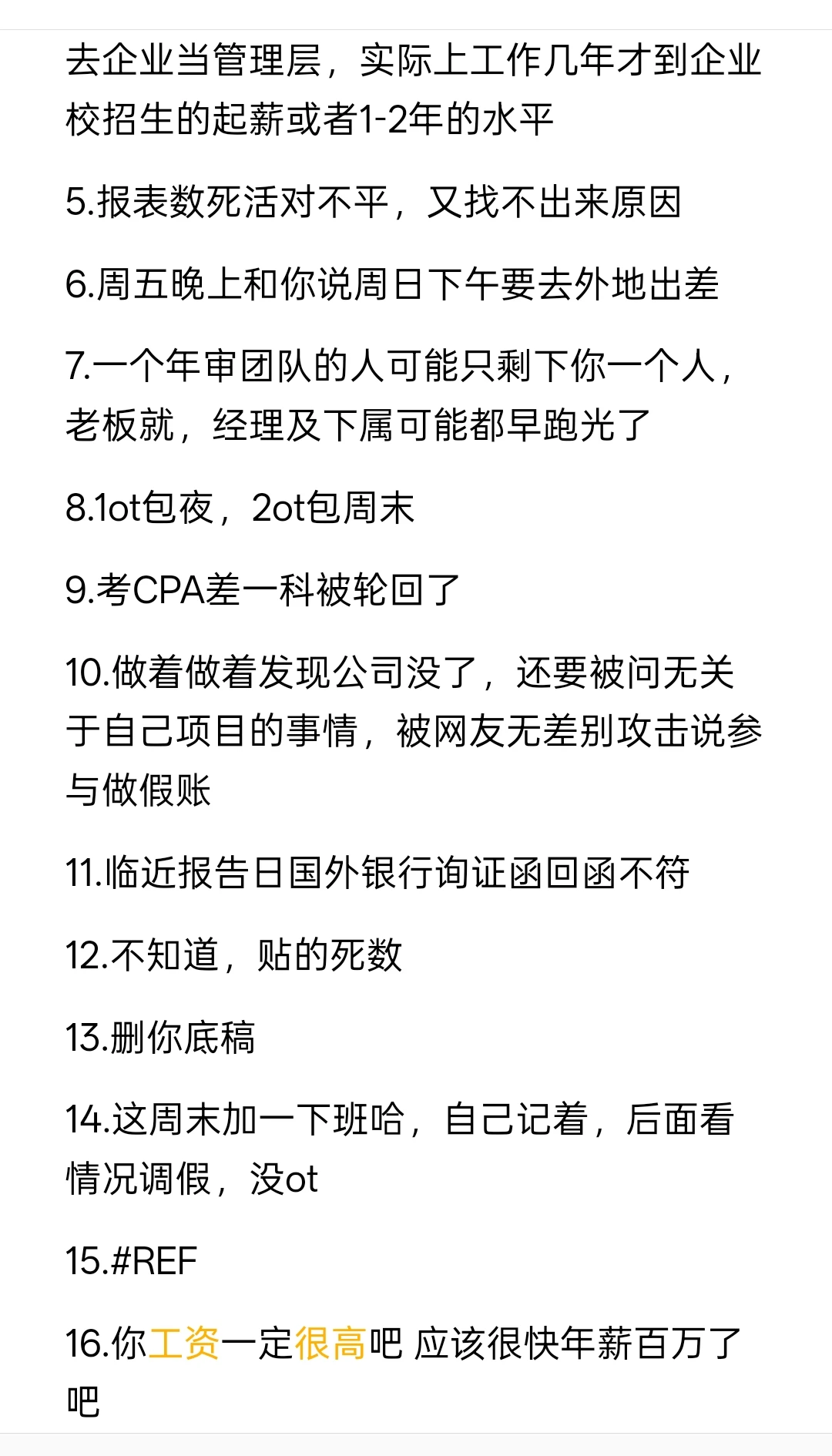 4.以为在事务所勤勤恳恳工作考证加薪能跳去企业当管理层,实际上工作几年才到企业校招生的起薪或者1-2年的水平