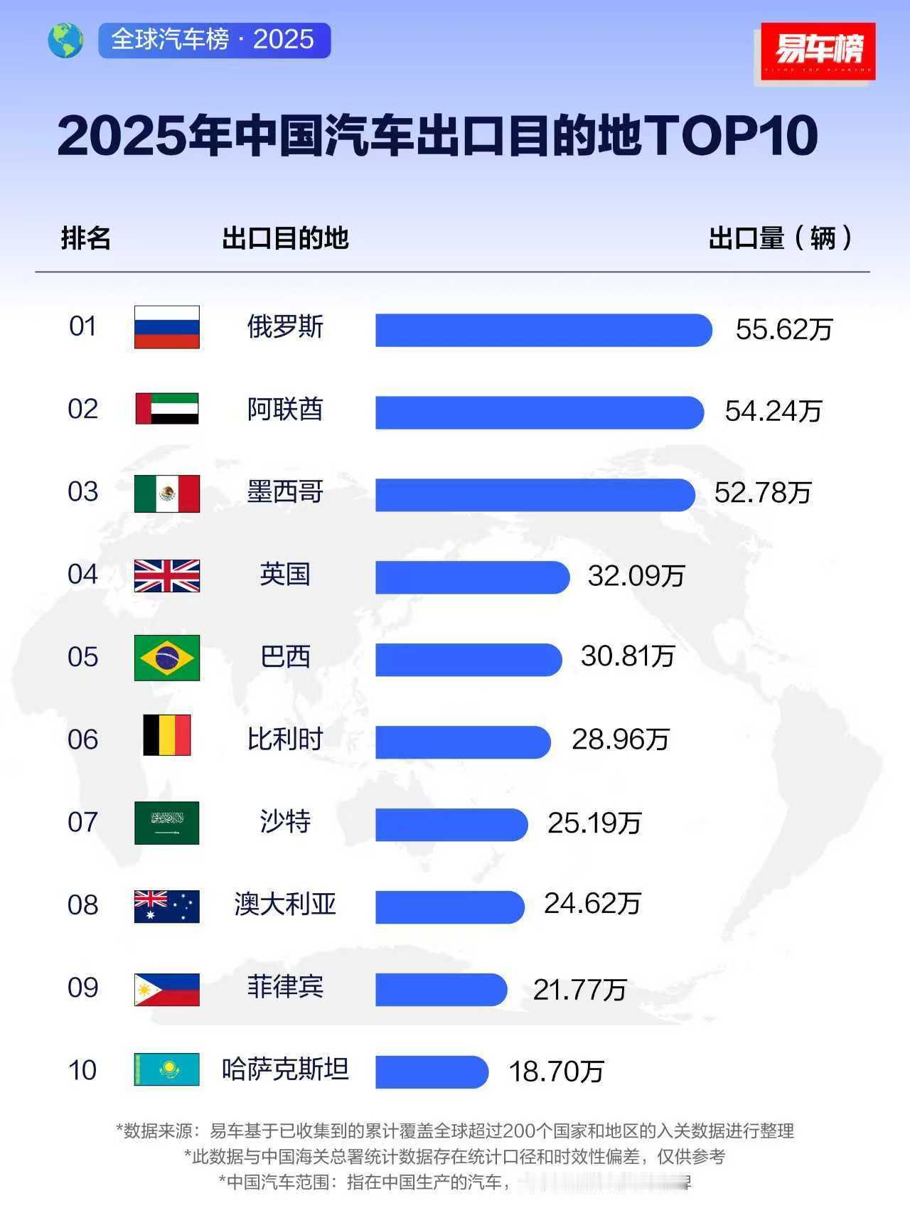 2025年中国汽车出口目的地TOP10俄罗斯第一,阿联.酋第二,