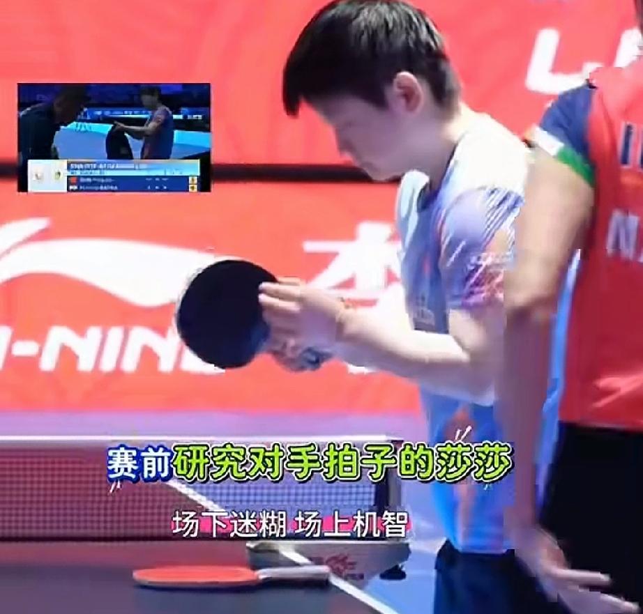场下迷糊 场上机智的莎莎上线了。 真是个大聪明。 比赛前莎莎拿着巴特拉的球拍,反转研究下,想看看这球拍和自己的有啥区别。 看了四五秒才放下。 莎莎真是场下迷糊,场上机灵,知道自己想要啥,知己知彼百战百胜,最后果然3:0巴特拉。痛快!