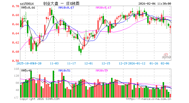 2月6日,截止午间收盘,创业大盘ETF西部利得(159814)涨0.00%,报0.656元,成交额1241.51万元。创业大盘ETF西部利得(159814)重仓股方面,中际旭创截止午盘跌0.57%,宁德时代涨2.52%,新易盛跌2.14%,东方财富跌0.52%,阳光电源跌0.25%,胜宏科技涨4.37%,汇川技术涨0.66%,迈瑞医疗跌1.26%,天孚通信涨0.33%,亿纬锂能涨4.35%。