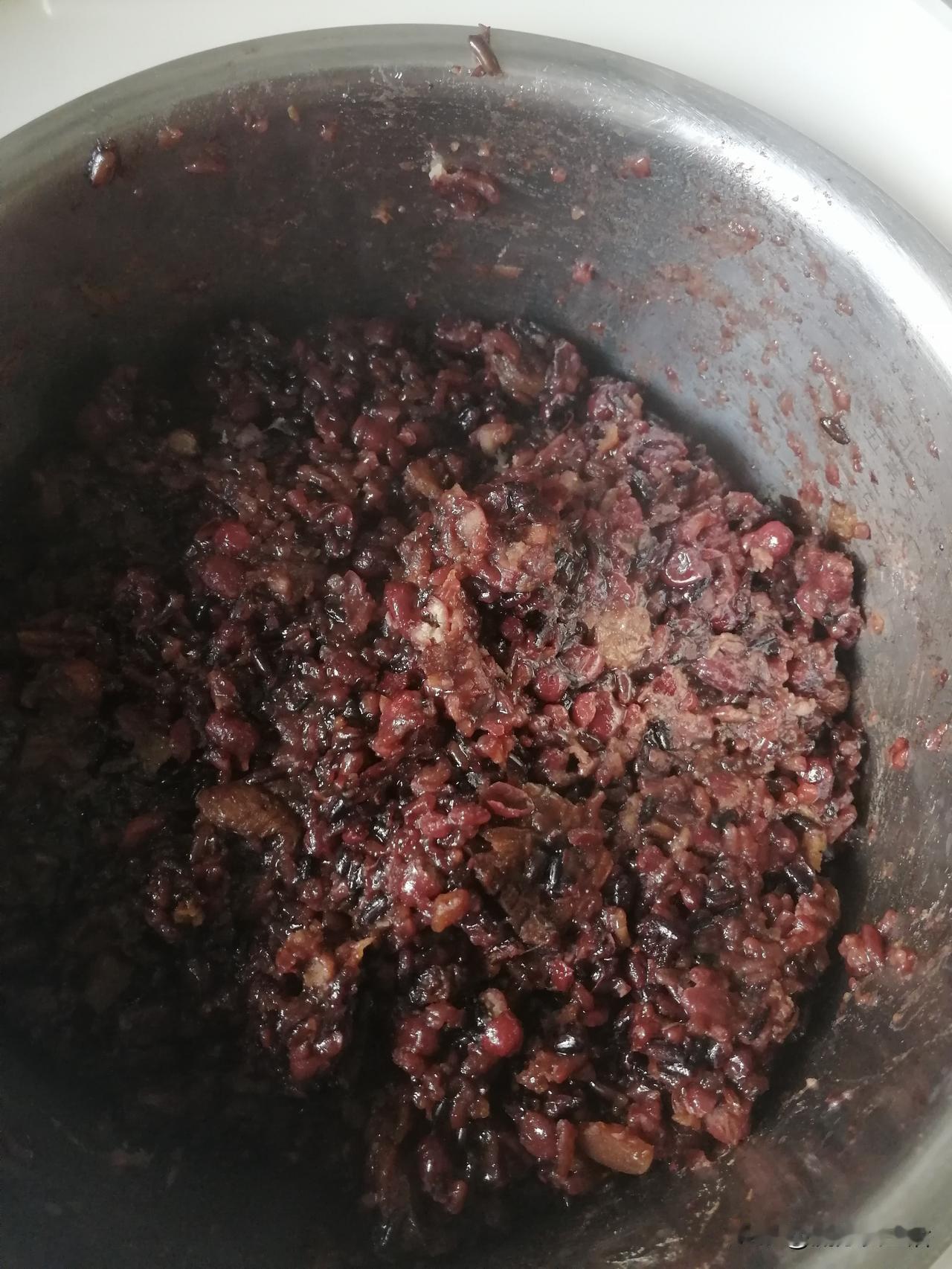 自己做饭团 饭团说起来也算是八宝饭的一种,孩子们尤其愿意吃。其实老年人胃肠要是可以的话,吃点八宝饭对身体很有好处。 八宝饭的材料都属于粗杂粮,有些还是种子类的,别看小小一粒种子,它的能量可不小,任何一颗农作物的生长,起初的能源都来自种子的能量。 所以人类也应该适当食用种子类食品,给身体增加能量。 今天做的八宝饭有红豆,黑米、血糯米、江米、红枣、桂圆和葡萄干。 米类除江米外都是昨晚就上的,红小豆今早单独煮了半小时,才整体放电饭锅里的。 加水量比平时做米饭多放点,我是三杯米,加水到四杯米的量,因为粗杂粮吸水率高,又加了红枣。再说八宝饭太硬了不如稍软一点口感好。 一切准备好,按杂粮饭键就好了,坐等美味杂粮饭团。 出锅了,少软点,下次做三杯米,三杯半水就行。