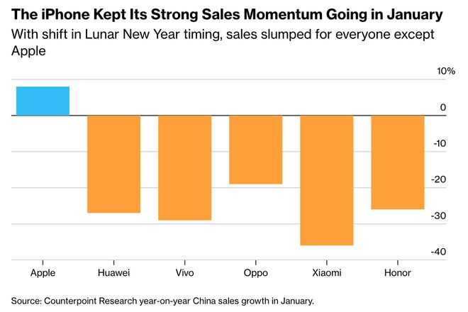 CounterpointResearch指出:“苹果成为唯一实现同比增长的主要品牌,其市场份额达到过去五年来1月份的最高水平。”“iPhone17基础版本现已符合补贴资格,提升了其性价比吸引力,并推动销量环比增长9%。”