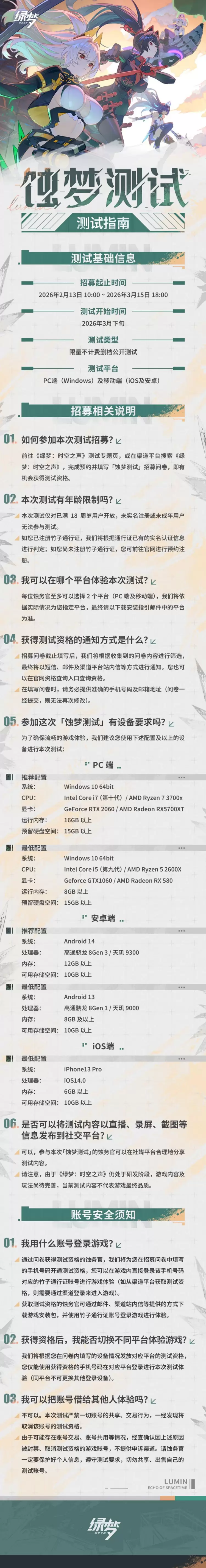 蚀务官,久等了,欢迎回到侵蚀管理局!今日(2026年2月13日),3D二次元横版ACT游戏《绿梦:时空之声》「蚀梦测试」招募正式启动,本次「蚀梦测试」为限量不计费删档测试,蚀务官可通过填写招募问卷、参与预约抽奖等多种途径获得测试资格。
