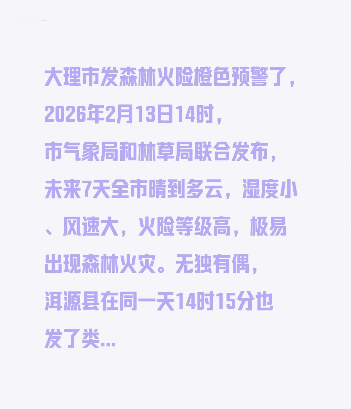 大理市发森林火险橙色预警了,2026年2月13日14时,市气象局和林草局联合发布,未来7天全市晴到多云,湿度小、风速大,火险等级高,极易出现森林火灾。 无独有偶,洱源县在同一天14时15分也发了类似预警,未来7天也是晴到多云,风速大、湿度小、空气干燥,火险等级居高不下。 大家可得多留意,在这样的天气下,进山游玩千万别带火种,不然星星之火都可能引发大灾难,保护森林安全,人人有责!